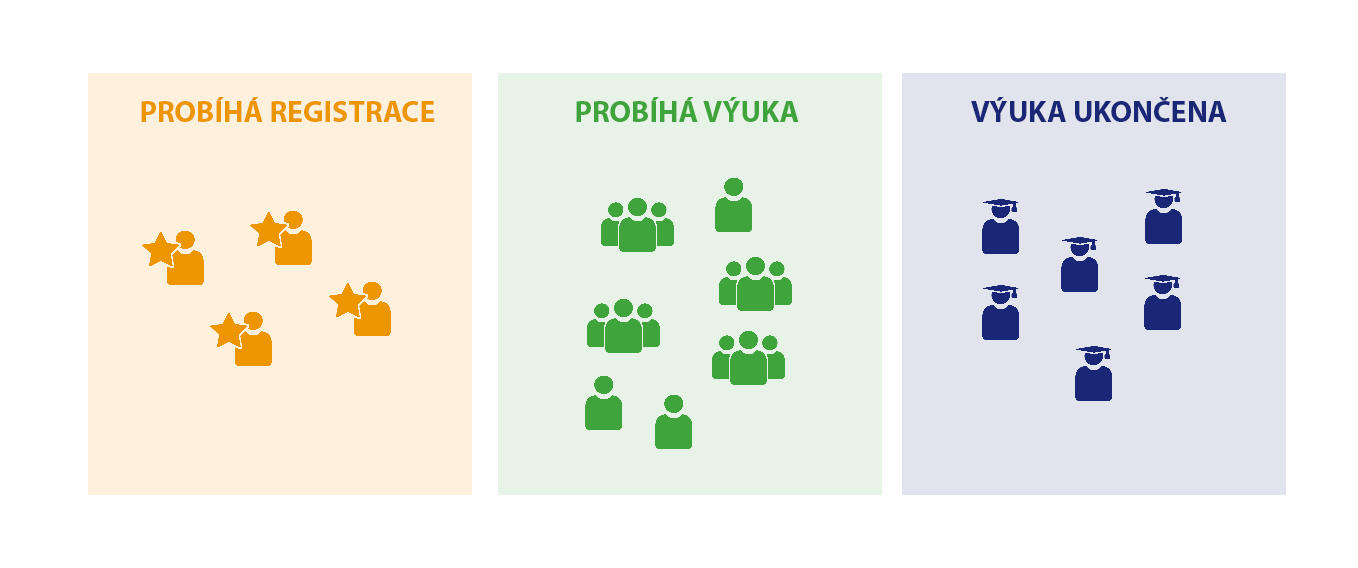 - „probíhá výuka“ (aktivní zapsaní studenti), fáze zahrnuje období zápisu a změn v zápisu, období výuky a zkouškové období plus 2 měsíce,